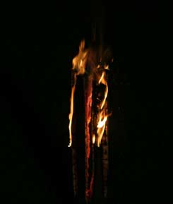 | 会場を取り囲む様に、ただの杉原木の切端と、BBQ用着火剤で、道具はチェーンソーだけで作った「ウッドキャンドル」を配置しました。これには、六つの意味があります。 | |||||||||||||||