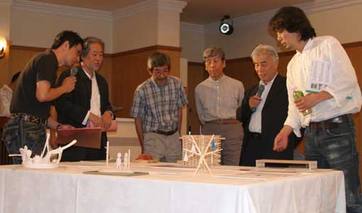 | 明けて21日10時半より、二次審査会が行われました。 内藤先生・篠原先生・川上先生・南雲先生に加えて、当日の朝、有馬先生も到着されて、審査会が始まりました。二次審査ミニチュアモデル応募作を壊さないように会場に持ち込み展示するのが、一番気を使いましたが、中にはお菓子で出来た応募作もあり、クロネコヤマトのクール宅急便で、要冷蔵シールの貼ってある応募作を受け取った作品集荷担当の木青会員も、これが届いた時は一瞬何事か理解出来なかったとの事です。 そして、審査の先生方のケンケンガクガクの末、ついに一般作品10点、子供作品4点が最終審査へと、駒を進めました。 |