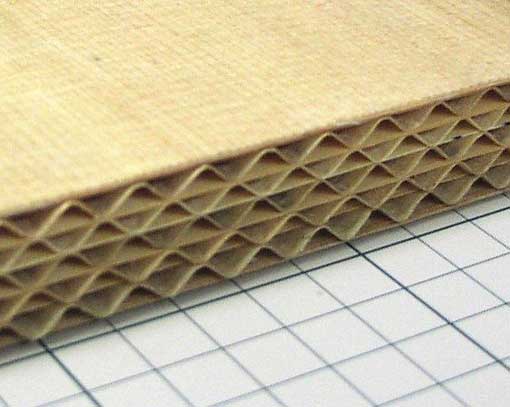 | 単板で作られた比重0.1の「木質段ボール」 背景の目盛は1cm | ||||||||||||||||