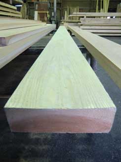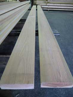 | 杉板の木口断面をご覧下さい。白太と赤味がきれいに分かれているのが分かります。この白線帯が杉板全体に入る必要があります。木表面は真っ白、木裏面が真っ赤、側面が赤白半々が理想です。 | 木裏面を上にしています。右側の板は全て赤味になっています。これでは日本酒が漏れてしまうので、日本酒の仕込み桶には使えません。 | |||||||||||||||