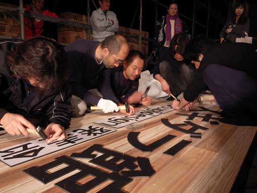 | 飫肥杉大作戦スギダラブースの施工風景。真ん中は急遽大工仕事を手伝ってくれた野木村さん。 | |||||||||||||