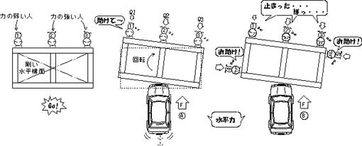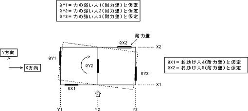 | A図で車の押す力Fによって移動しようとする箱を1〜3の三人が支えているとします。1の人が弱く少しの力しか支えられないと、Aのように他の二人が強くても支える力が違うので箱はバランスを崩して回転しようとします。押す力が小さいうちは2が回転を止めようとしますが、力が大きくなると他の二人の靴も滑り出し、ある一定以上の力は支えられなくなり、回転も止まらなくなります。 そこで、Bのように直交から4と5のように支えてやれば(直交壁が有効な耐力壁であれば)回転しようとする力を止めることができます。 これと同じことが鉛直構面と建物質量に生じる地震力の間でもいえます。 *本当は動いているときと止まっているときでは摩擦力が違うので弾塑性モデルにならないが、ねじれの説明としてはわかりやすいので、あえてこのように説明しています。 このようにして建物が変形する場合、その中のいずれかの耐力壁の変位が、限界(終局状態もしくは限界変形角)に達したときが、建物全体の終局状態になります。 剛床(変形しない)だと、耐力壁の変位分布は直線状になり、各鉛直構面ごとの変位は求めやすくなります。これと各鉛直構面の荷重−変位性能 (Fig.2-5)から最も最初に限界に達する耐力壁線を求めれば、そのときの耐力壁の耐力の和が建物全体の耐力となります。 |