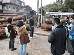 | 吉野中央木材で一般住宅部材を見学した後、カスガイメンバーの桝井製材所さんで、スギの和室材を中心に見学させて頂きました。桝井製材所さんの製品は京都迎賓館でも使われており、その施工写真にみんな興味津々で群がります! | |||||||||||||