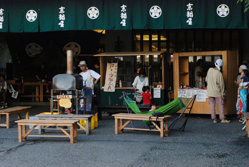 | バスの出発、終着地となったのはJR武雄温泉駅より程近いところにある京都屋さんです。バスを待っている間にお腹を満たしてもらおうと、移動式鉄製ピザ釜による天然酵母のピザ(今回は燃料にも杉を使用!杉ピザです)、オーガニックなカレーと手打ちうどん、そして京都屋さんの社長さん自らが握った佐賀牛の柿の葉ずしなどが用意されました。杉屋台で販売され、とっても和やかな雰囲気になっていました。お土産としては多久にある造り酒屋「東鶴」さんと嬉野温泉にある「井出酒造」さんに協力していただいて、白木の杉ちょこが2つついた地酒セットを各旅館で販売。「東鶴」はデザイナー北島敬明さんによる杉ラベルで特別にご用意!大好評にて早々に完売いたしました。 | |||||||||||||||