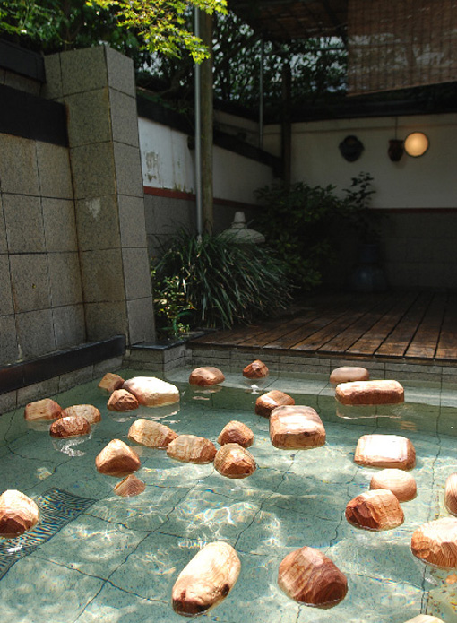 | ちらしの表紙にもなっているのが、武雄温泉の京都屋さんと嬉野温泉の旅館大村屋さんに共通の目玉企画「杉ダマ温泉」です。男女各温泉に50個ずつ球体の杉のオブジェ、杉ダマを浮かべて杉の手触りと香りを楽しみながら温泉を堪能していただきました。1つがだいたい30×20×10センチくらいあって結構大きいので、それが湯船にわらわらと浮かんでいるとそれだけで相当なインパクトがあります。実際に入ってみましたが、杉ダマをなでたり、においをかいでみたり、沈めてポコンと浮かばせたりしていると、なんだか楽しくなってきます。杉ダマが浮かぶ光景も妙にしっくりきていて、イベント期間中だけでなく常に浮かべていてもいいくらい。一緒になったお客さんも入ってくるなり、わあー!と歓声を上げていらっしゃいました。それにしても各旅館分の杉ダマ200個をこつこつと製作された実行委員のみなさんのご苦労には頭が下がります。 | |||||||||||||||