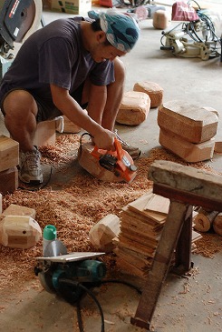 | 私の父は大工です。実家にある作業場には材木が並び、木くずや鋸屑を使って、小さい頃から職人さんの仕事の脇でよく遊んでいました。私の原点は父とそのまわりの職人達と、そしてこの作業場にあると言ってもいいと思っています。 今回の企画の一つであった杉玉温泉の杉玉をはじめ、温泉手形、杉ぐるバス停、看板などはその作業場で制作しました。 | |||||||||||||