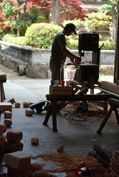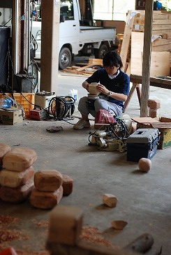 | 8月。真夏の暑い日の作業。合間に顔を上げると、大のオトナ4人が、汗だくになりながら黙々と杉玉を削っている。それを大工の父が眺めている。 普段は職人たちの仕事の場。同じ材料、ほぼ同じ道具を使っているのに、なんだかとてもおかしい。おかしいんです。必死に作っているのがゴロゴロ転がる杉玉なものですから。 | |||||||||||||