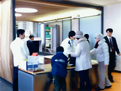 | このデザインが評価されるべきポイントはまず、空港という交通施設環境の向上を目的とするプロジェクトにおいて、外観でもロビーでもなく、通常はほとんどデザインの対象として扱われていない保安検査場に着目し、このインテリア環境をリニューアルすることによって、搭乗手続きというプロセス全体の質的向上、及びその結果としての宮崎空港のイメージアップに多大な貢献を果たしたと考えられる点だ。 チェックインから搭乗までの一連の空港利用プロセスにおいて、いうまでもなく保安検査場のセキュリティ・チェックは、テロリスト搭乗阻止までも視野に入れた警戒性の高い治安維持業務であり、固定式金属探知機にて旅客の身体を検査し、X線にて携行手荷物内の危険物持ち込みを検出するものである。必要不可欠な機能であるのは当然だが、旅客にとっては危険性の有無を「疑われる」場であり、旅の楽しさや期待、あるいは過ごしてきた思い出など、すべてのポジティブな心情がその場では凍結され、心理的負担が避けられないネガティブな場ということができる。 一般的にどこの空港も、保安検査場は簡素なパーティションに仕切られた無機的な空間で、警備服に身を固めた検査官が義務的な態度で粛々と検査業務を遂行しているのが通例である。 この保安検査場をデザインの対象に選んだところに、まず戦略的な独創性がある。 また、空間整備に合わせて、検査官のユニフォームもリニューアルされた。警備服というよりはホテルマンの制服のようなデザインであり、このこともデザイナーの目的が、単なるモノに留まらず、「場」の演出にまで行き届いていることをうかがわせる。治安維持業務としての機能性に支障があってはならないのは当然として、通常はその結果旅客が受け取ることになるネガティブなメッセージ性をデザインで反転させようという意図が徹底しているのである。 具体的にデザインを見ていく。 無味乾燥の場となりがちな保安検査場に、木質素材の中でもっとも柔らかいといっていい、スギという素材を徹底して持ち込んだ。検査場の空間全体にスギ材をルーバー状に用いたことで、空間に軽快感や解放感が与えられた。 さらに、人の動線に呼応して天井のルーバーはヴォールト状に削り込まれており、旅客はゆるく木質に包まれて誘導される。この空間演出は、ここが治安維持と同時に「もてなし」の場でもあるというメッセージとなっている。天井やパーティションに組み込まれた、照明及びステンドグラスはいずれも円形で、これもまた空間全体に柔和な印象を与えている。 |