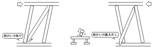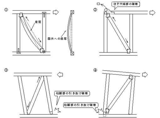 筋かいの耐力には方向性があります。また、よく「筋かいはもろい」と言われています。なぜこのように言われるのでしょうか。筋かい耐力壁が力を受けるときの実際の挙動は下記のように考えられます。 |