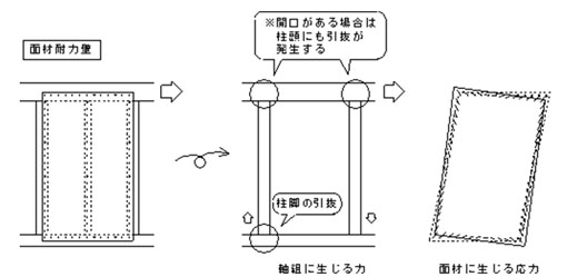 | ファスナー(釘)の配置と応力の分布によって耐力が変わってくることは「第1章 4 面材」の項で説明しました。 耐力壁として考えると、力の釣り合いから、軸組(枠組)にも力が生じます。特に、転倒モーメントによる柱脚の引抜き力は、耐力壁の縦横比の関係から大きくなります。 また、一本の梁上に耐力壁が連続する場合の浮き上がり(→第3章 1-7-2 浮き上がり)は、柱頭側にも引抜力を生じさせます(Fig.3-2)。このため、通常の場合は、柱頭・柱脚にはこれらの力に十分耐える金物が取り付けられます。 | ||||||||||||||