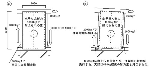| 柱脚部の引抜き力が処理されていないと柱脚の引抜けで耐力が決まってしまいます。柱脚が十分補強された面材耐力壁Aが1000kgの水平力に耐えられるとします。このとき、Aの柱脚には3000kgの引抜き力が生じています。面材部分が同じ仕様の耐力壁Bで柱脚部が2000kgの引抜き力にしか耐えられないの場合、柱脚の引抜き力の制限から666kgの水平力にしか耐えられません。 | ||||||||||||||