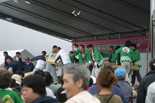 31日やまんかん祭りラスト、西都木青会全員で餅まき