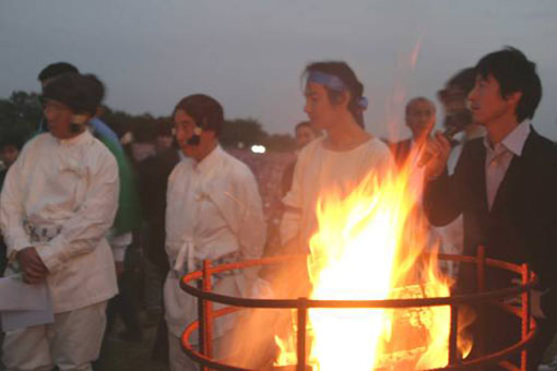 30日薄暗くなってきた杉コレ審査会場、かがり火に照らされながらプレゼンは、続く