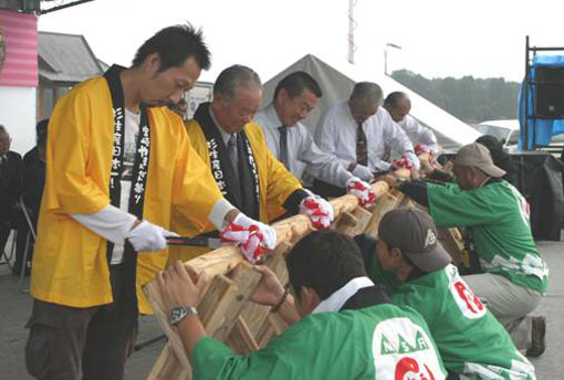 31日やまんかんオープニングセレモニーの丸太切り