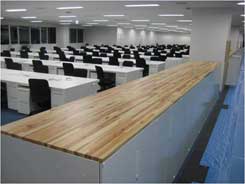 | その他、企業のオフィスの提案の中にも必ずと言っていいほど、杉のインテリアやobisugi designのプロダクトの提案を織り込んでいる。 福岡でのプロジェクトの規模からしてそんなに大量な受注というのはまだないが、昨年の夏あたりから提案中であった、とあるメーカーの工場オフィスにおいて、スチール製の収納庫の天板を地場産杉材にしよう、という提案が最後まで生き残り、幅1800mm×奥行き450mmの天板900枚を納品することに成功した。 今時はオフィスにお金はかけられないというのが、風潮のようになっていて、本当に工業的に作ったスチール家具製品だけで構築される無機的な空間が多いのである。「あまりにも寒々しくなるので、是非、木製品を部分的にでも入れて行きましょう!」という提案の脅し?が利いたのか、コスト的に何とかなるアイテムとして今回の収納庫の天板が生き残ったのである。 |