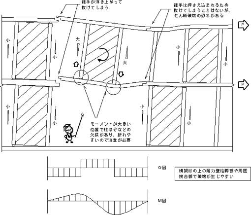 | 梁に曲げが生じ、変位が大きくなります。これにより、耐力壁の見かけの剛性が小さくなってしまいます。モーメントが大きい位置に柱や直交する梁の断面欠損があるので、その部分で梁が折れやすくなります。(Fig.3-23,24) また、梁仕口の形状によっては、仕口が外れてしまうことも考えられます。 |