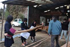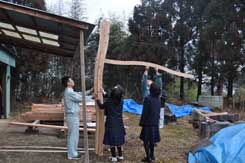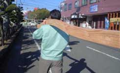 | 曲がり材をかついて日向のまちを歩くM課長 | ||||||||||||||||
