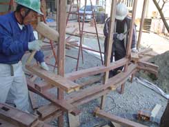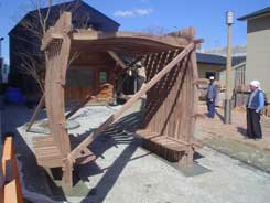 | 写真をよ〜く見てください。柱を基礎に入れているでしょう。ここが、構造上・製作上この作品の大きなポイントでした。専門用語を使うと「固定端」にしたことで、この作品は成立しました。 | ||||||||||||||||