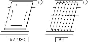 | 床材の仕様には面材と板材がありますが、その性能は大きく異なります。(Fig.3-36) 面材(合板):面材自身の性能は釘打ちによって性能が決まります。→第1章 4 面材 板材:面のようにせん断力を伝達できないので、接合部の回転で抵抗します。 |