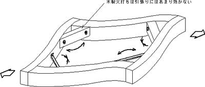 | また、一般によく用いられている火打ち梁には木製のものと鉄製のものがありますが、木の火打ちは引張られる方向に力がかかる場合にあまり抵抗できないようです。 | |||||||||||||||||||
