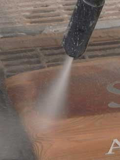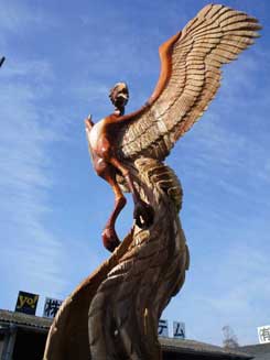 | ハイブリッドブラストによる加工。水を混入しながらのブラスト加工は 研磨剤の粉塵を撒き散らさないクリーンな技術。 | ハイブリッドブラストという吉岡さん独自の方法 でうづくり加工されたチェーンソーアート作品。 | |||||||||||||||