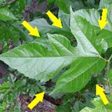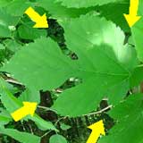 | ヤマグワの葉は変異が大きく、切れ込みがないものから、1つ切れ込みがあるもの、2つ、3つ、4つなど、いろんな形態をしています。図鑑では切れ込みのないタイプが描かれることが多いので葉っぱだけで覚えるのは要注意です。 一つの枝にはいろいろなタイプは混在しません。 |