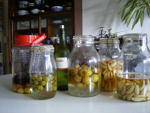 | 今年もやってきた漬物の季節。 らっきょうの甘酢漬け、塩らっきょう、青梅のシロップ、完熟南高梅のシロップ、そして梅干しの下漬けまで済ませるとようやくホッと一息です。あとは梅雨明けの土用干しを待つだけ。 今年のらっきょうはいい感じにできました。塩らっきょうのスライスに鰹節をかけて……酒が進みます。 |