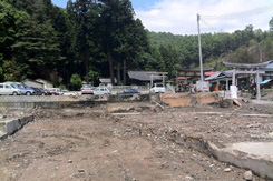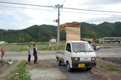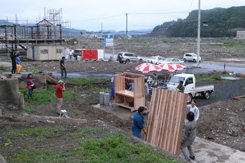 さて、Xデーは翌週へと迫った。アチコチ出張行くも大槌が気になって電話する。柏崎さんは、「う〜ん、じっさいなかなか難しいですが、そこは少し変更して対応していますから、大丈夫ですよ。」フッと不安になる。少し変更?どこをどう変更したのだろう。 上田さんは「製作を時々見ていますが、作業はかなり難航しています。うちも手伝ってあげたいのですが、仕事が佳境で現実なかなか厳しいです。すみません。」不安は増す。しかし冷静に考えて見ると、建具やさんが作るような奇麗な屋台を期待することの方がおかしい。みんなが力を合わせ、作りあげることに価値がある。多少かっこ悪くたって大事なことはそこなんだ。と納得。心配は解消する。尾崎さんも地元に配るチラシを作成した。(協力:スギダラの文字もちゃんと入っている。)作戦はいよいよ大詰めを迎えた。 ● そして出発の22日になる。本来は23日発であったが、それでは時間が足りず、前日の夜行バスで行く事になった。えっ待てよ、22日は若杉さんとBC工房の鈴木さんと10年ぶり呑もうと言っていたのだ。しかもその前に秋葉原に行って屋台の電球始め、電設の買い出しをしなければならない。夕方から走った。秋葉で猛ダッシュ。すべて買い出し終了し若杉さん達のいる青山へ向かう。と思った瞬間、さっき乗ったタクシーにバックを忘れていたことに気づく。すぐ電話をし、30分後にそのタクシーと再会。そのまま乗車し青山へ。助かった。 結局設置場所は小槌神社の真下に決定。実は一番最初の候補地だった。そこは柏崎さんの友人の土地で使用許可を貰えたという。素晴らしい人脈、良かった。そしてそこには柏崎さんの別の友人の協力で採石が積まれていた。チームは二班に分かれ、整地チームと屋台製作班。さっそく作業に入る。僕はその前に柏崎さんが瓦礫の中に見つけたキャスターが屋台に使用出来ないかどうか確認に行く。「あれですよ。」柏崎さんが指さしたものは瓦礫の山のトップにある歪んだ台車であった。「もう一つはあれです。二台分あります。」同様のものであったがサイズが違う。もっと言えばボルト接合であったので今回の木製屋台には使えそうもない。何とか諦めていただき、購入することにする。そして上田製材所脇の組み立て現場に向かう。 |
