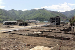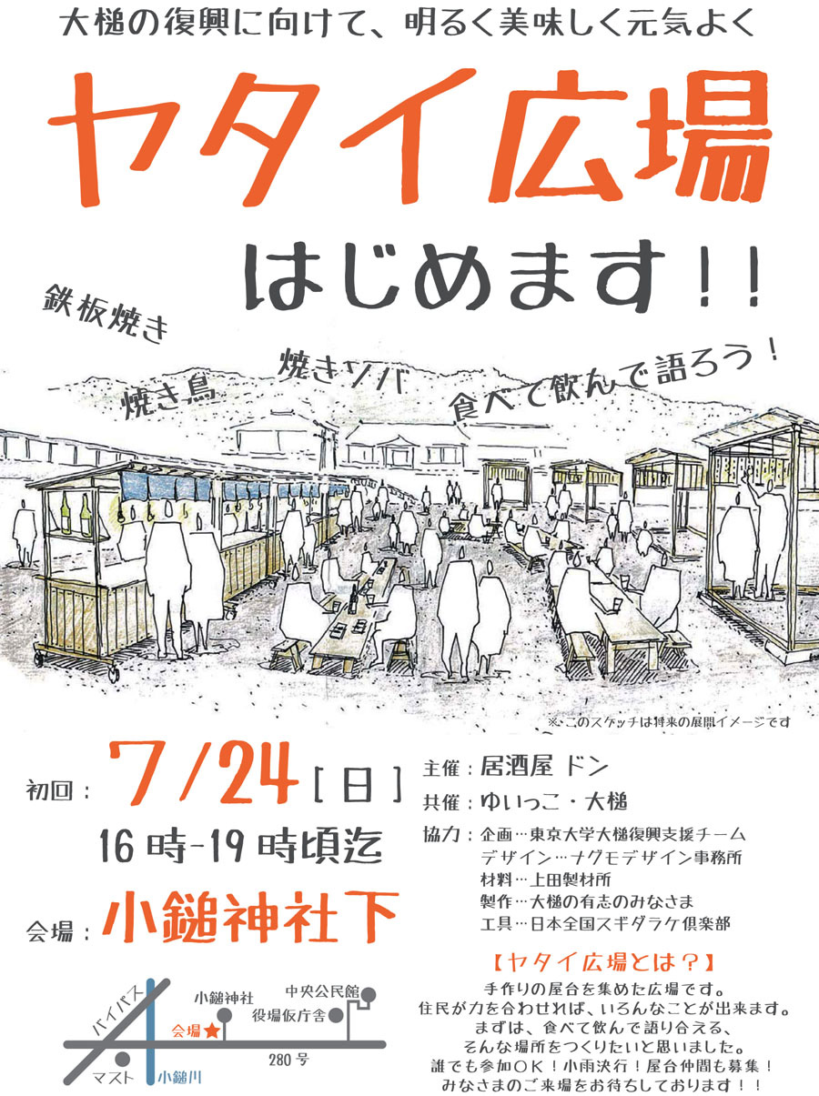2011年6月9日、本郷の居酒屋「ゆい」で、大槌の復興支援を行っている東大景観研究室の中井さんに屋台作戦の概要を聞いていた。 ● 6月14日東大の復興支援チームに同行し、岩手に向かう。朝一番の新幹線に飛び乗り、北上駅で尾崎さん達と合流、前泊の中井さんと落ち合う。そのまま車で大槌に向かう。2時間程度掛かり現場に着いたのは昼頃だった。あたり一面何も無くなってしまった中に小槌神社が残っていった。400年以上の歴史を誇る由緒ある神社だ。鳥居には火に焼かれた跡が生々しく残っているが、奇跡的に無事だった。その神社の前が屋台作戦の候補地である。「何とかここにねぇ、地域のよりどころを作りたいのですよ。」中井さんが言う。ひととおり現地を確認した後、3kmほど先の会食の場、波板海岸「さんずろ屋」に向かう。ここは高台に建っているため難を逃れた。そこから見える砂浜と松の光景は、あれほどの津波が来たとは信じられないほど平穏で美しかった。 |