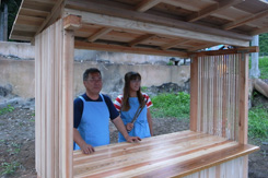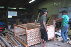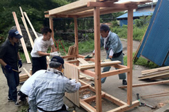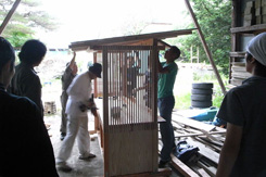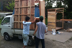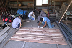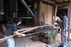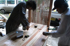 現地ではすでに漁師の方、大工さんにより一台目のフレームが組まれていた。ホゾ加工に苦労の後が伺える。頑張ってくれている。上田さんと全体的な打合せを行い、僕らはまず二台分の屋台の材料にプレーナー加工するところから始めた。材料的には相当の量がある。四人で流れ作業をするも相当腰に来た。午前中それで終わった。午後は屋台の仕上げと屋根班、ベンチ班に別れ作業を分担。話しによると今日の夕方プレオープンを行うという。一台目の完成は至上命題になった。 |