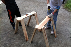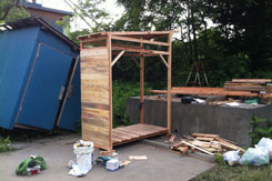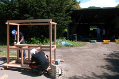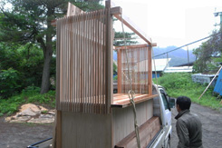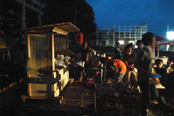 ● 気がつくと風呂も入らないまま朝を迎える。今日はもう一台の屋台と絵馬小屋という小屋を二台、ベンチ4台作る予定。屋台は二台目なので結構はかどる。と思っていたが食事を挟み1時頃に焦り始める。現場からは3時にはすべてセッティング完了し、4時に本オープンをしたいとの連絡が入る。絵馬小屋を侮りすぎた。尾崎さん、原さんと段取りを行うもこれからホゾ加工を行い2台製作は不可能。結局ホゾ加工無し、製作台数一台に変更した。しかしそれも主材が木だからなせる技。人間の力で大抵のことは何とかなる。 |