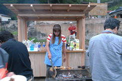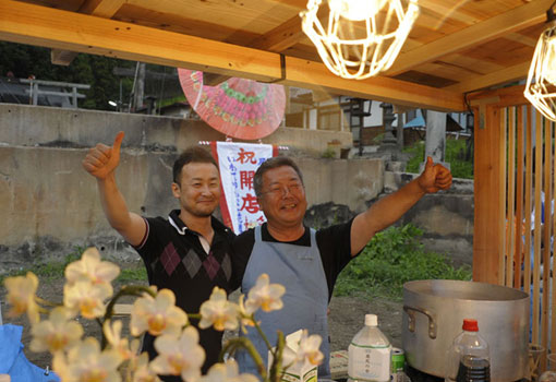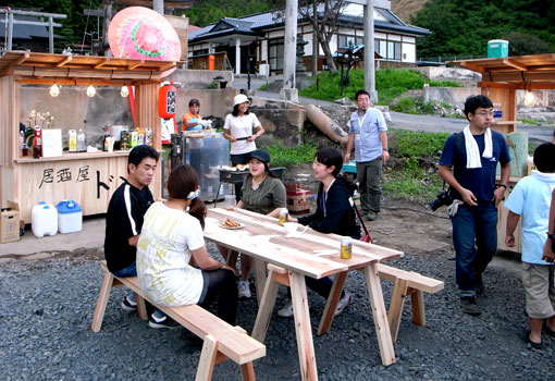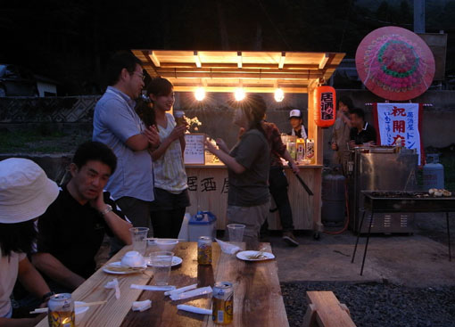 柏崎さん夫妻はすでに仕込み、準備を終え、屋台の到着を待つばかりであった。所定の位置に屋台をセットすると自然と拍手が湧いた。ベンチテーブルも届き、プレオープニングがスタートした。関わった関係者が飲み語り、いつまでも笑い声があたりに響いていた。良い感じだ。ずっといたかったが照明も無いし、明日もある。心地よい疲労感を抱えたまま民宿タカマスに向かう。今日は初めからためらわず一升瓶を注文。疲れたが良かった。みんなで乾杯し美酒に浸る。 |