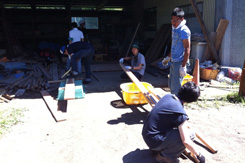 | 地元の漁師さん(左)キャスター取付。 | 老体にむち打ち!?天板固定。 | |||||||||||||||