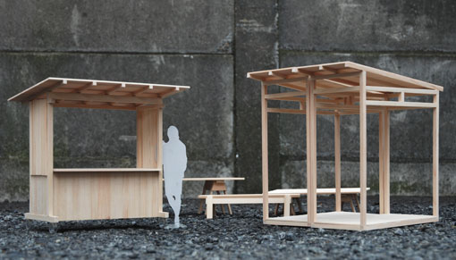 しかし、なんと素晴らしい連係プレーだろう。良い感触を掴みながら釜石駅に着く。釜石で合流した西山さんにその事を興奮しながら語り、ビールを買い込み電車に乗り帰路に着いた。 ● 次回打合せまで2週間時間貰った。それまでに屋台のデザインスケッチ、モデル、図面などを用意する事になった。途中東京で尾崎さんと打合せを行い、こちらのイメージを共有する。最初の第一ステップ、それで終わりではなく、発展系も理想形としてイメージしておこう。つまり最終的に地域のパブリック空間を作ることを目標にした。 |