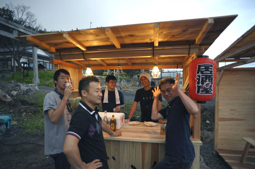 疲れているのにみんな実にいい顔をしている。徐々に地元の皆さんも集まってくる。柏崎さんが自分の店名「居酒屋ドン」を筆で書き上げる。本当に嬉しそうだ。 そして点灯式を行い小さなあかりが灯った。本当に小さな、小さなあかりであるが、みんなが集まれる場所がとりあえずひとつ出来た。赤崎さん、柏崎さんのネットワーク、東大支援チーム、上田製材所、誰が欠けても出来なかった。みんなの力で出来た宝物である。 オーナーは柏崎さんであるが、この広場はきっと大槌のみんなの思いが詰まっている、そんな風に思えた。明らかに人間模様だ。そして「居酒屋ドン」の海の幸の焼き料理、アラ汁。奥さんの焼き鳥、みんな抜群に美味しい。アルコールの勢いもあって楽しい場は瞬く間に時間が過ぎていく。 それにしても柏崎さんの人脈には改めて恐れ入った。敷地、発電機、プロパン、果ては杉材まで何でもその日のうちに用立ててしまうのだから。 間もなく上田製材所の上田専務が見えた。大変だったがその顔は満足そうだ。「あなたがいたからこの屋台が出来た。本当にありがとう上田さん。」そしてその場でスギダラ大槌支部が結成されたのだった。 |