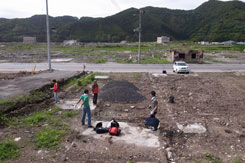 間もなく柏崎さん、奥さんのミカさん、そして赤崎さんらと会う。赤崎さん自身も被災者でありながら、しかも30代の若さでありながら、その立ち振る舞いの元気なことに正直言って驚いた。とにかく頑張るしかないんです。その言葉にはひとつのブレも感じられないどころか自分よりよりまず他人、の精神が伺える。 |