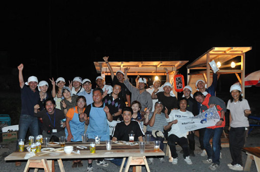 | さあ、帰りの時間も近づいた。関係者一同記念撮影。みんなご苦労さん。とてもいい顔しています。 上田製材所のタオルを頭に巻く。前列右から三人目が上田さんです。ちなみに未婚! |