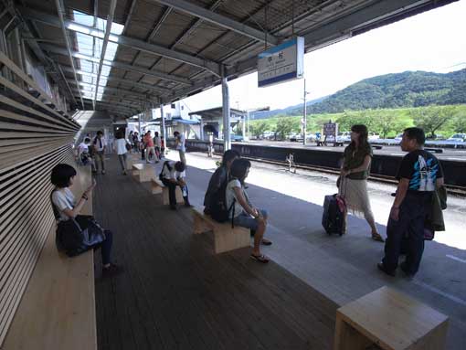 | お客様には、駅ホームでしっかり見送りと出迎えをして頂く。その僅かな時間が豊かになれば、鉄道を使おうというお客様も増えるかも知れない。そのために、1番線ホームからコンコース、駅舎内の待合室までを一体的に四万十ヒノキで空間を創りあげた。 | |||||||||||||||