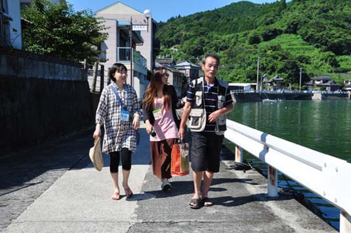 現在、高浜地区振興会では、3年前より熊本県の支援を受け「夢あるまちづくり」事業を展開しています。その一環として今年2月に実施された「高浜シンポジウム」。そのパネリストの一人に九州大学大学院の藤原教授がいらっしゃいました。天草最果ての町をいたくお気に入りになられた教授は、「今度は、生徒を連れてきたい!」。突然のオファーに対応が出来るかどうか戸惑いました。なにぶん、このようなイベントに慣れていないため、どういう準備からはじめればよいのかと大いに迷いながら、各署と相談を重ね、振興会のプロジェクトメンバーの協力を得て、なんとか開催にこぎつけました。 |