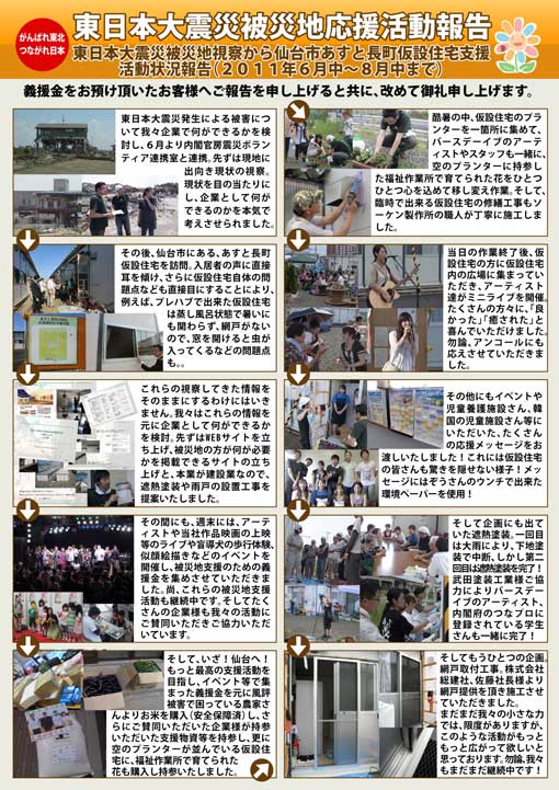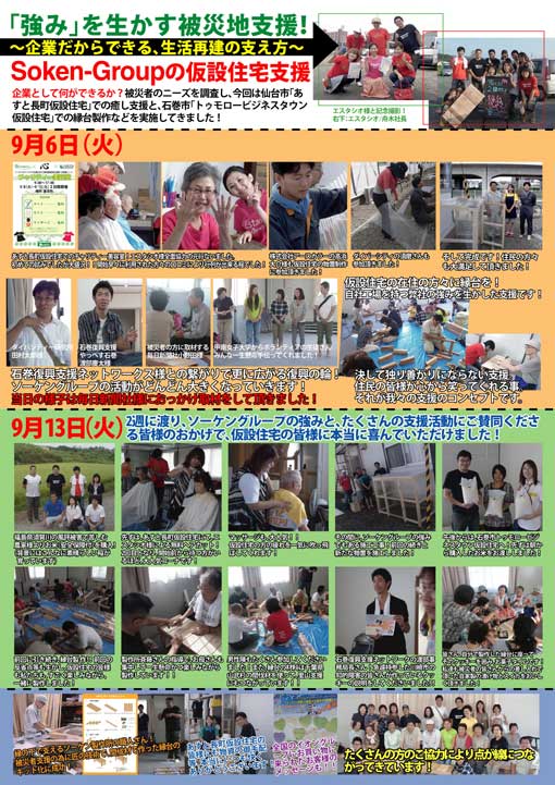 | 大震災から半年が経ち支援の輪が風化しないように、9/6と9/13に仙台市:あすと長町仮設住宅様(300戸)と石巻市:トゥモロービジネスタウン仮設住宅様(1000戸)様を支援活動の一環として、訪問させて頂きました。 | ||||||||||||||||
