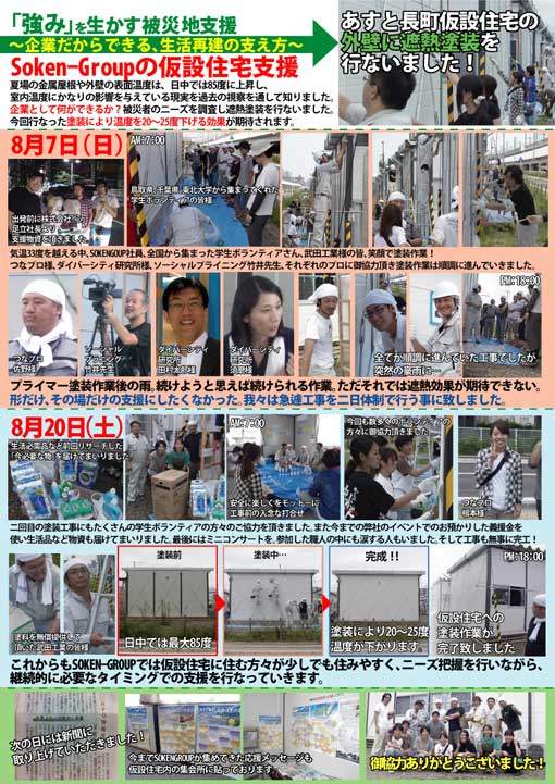 | 仙台のあすと長町仮設住宅における外壁の遮熱工事に端を発したこの一連の復興支援活動。仙台から石巻に広がっただけでなく、同じく被災地である福島の農家を繋いだり、本業とは関わりの無さそうな音楽イベントやチャリティ美容院の開催等、よくぞここまで!と言った感じだ。 | ||||||||||||||||