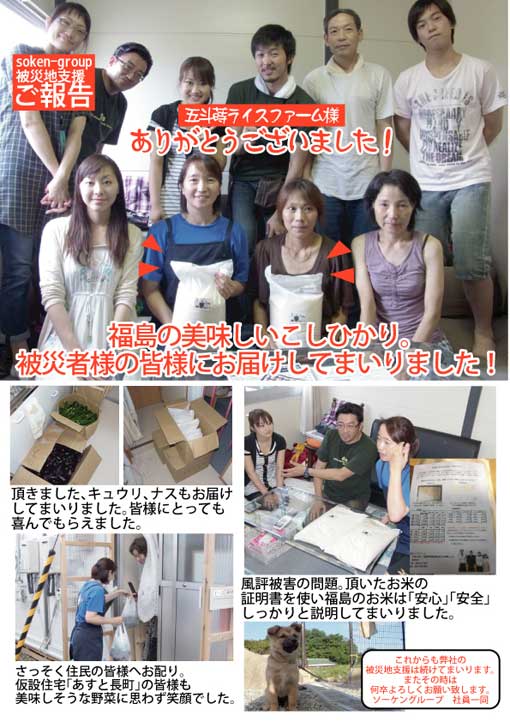 | 風評被害で苦しむ福島県須賀川のお米農家様に、第三弾として今月もイオングループ様の全国横断東日本大震災の義捐金活動で集めた善意のお金から購入させて頂き、同じく川崎市の福祉作業所様のクッキーもご一緒にお届けに上がらせて頂きました。 | ||||||||||||||||