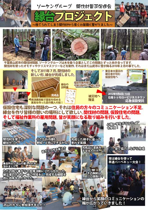 | また、本業の強みを活かし間伐材を使った縁台で仮設住宅の皆さまとご一緒に工作し、孤独にならないように被災者同士のコミニュケーションツールとして友達作り(特に男性のお年寄りの皆さん)のきっかけ作りなる取り組みと被災者のニーズの高かった物置設置工事を支援して参りました。 | ||||||||||||||||