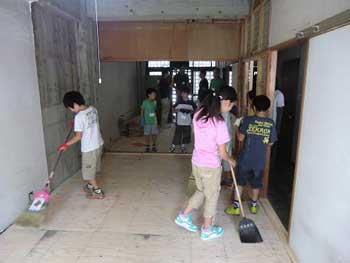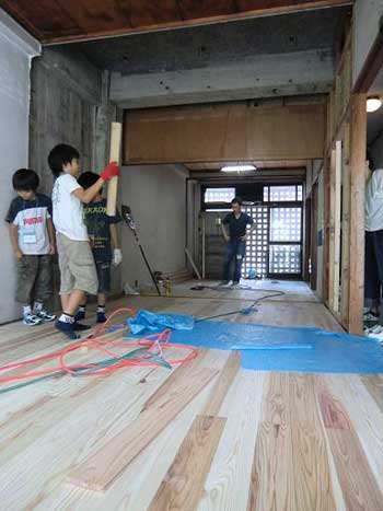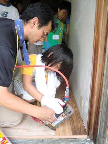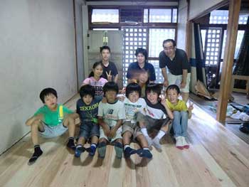 | そして、2011年7月23日にさたけん家で床貼り体験会を行いました。前回のハッピースポットと同様、子供たちと一緒に大工工事を頑張りました。さたけん家2階に吉野杉フローリングを貼りました。 | |||||||||||||||