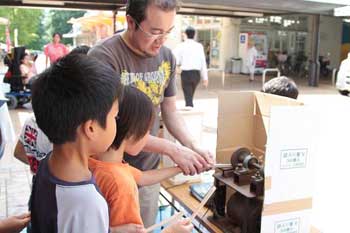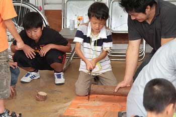 | 同じく丸太切り体験。右の写っているのは、team kasugaiメンバーのウッドベースの菊谷紀恵さん。 | |||||||||||||||