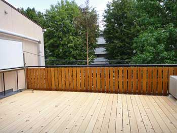 | 2階のコミュニティースペースから続くベランダは吉野桧のウッドデッキ。開放的な雰囲気で、心地良い空間です。夏はここでビアガーデンかな? | |||||||||||||||