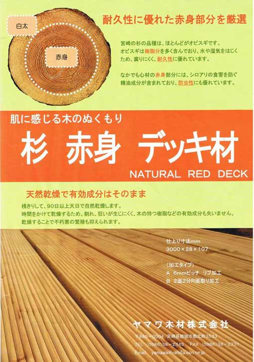 | 船に使用される材で樹脂分を多く含んでいるために水などを弾くために耐久性に優れています。宮崎の杉の特徴をつかんだ商品なのです。それだけではありません。宮崎の杉のなかでも、心材に近い赤身の部分は、シロアリなどの嫌う精油成分が多く含まれていますので防虫性もあります。さらに、ヤマワ木材では、桟きりにして、90日以上天日乾燥をしているそうです。この天然乾燥が、ミソ!時間をかけて乾燥させるため、割れや狂いが生じにくく、木の持つ樹脂などの有効成分も失わず、木材を腐らせる腐朽菌の繁殖も抑えられると言う良いことずくめなのです。宮崎杉の特性をフルに生かしたこの商品は、3000×28×107のサイズで販売しています。 | ||||||||||||||||