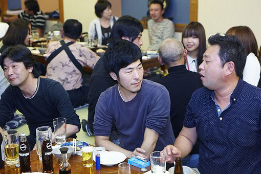 | 秋祭り前日夕方。屋台屋の屋台が組み上げられ、全体の雰囲気が整いだし、期待感と高揚感、そして少しの不安感のなかで決起集会。やっとここまできた。あとは売れるかどうか・・。皆がそう思っていたに違いない。 | ||||||||||||||||