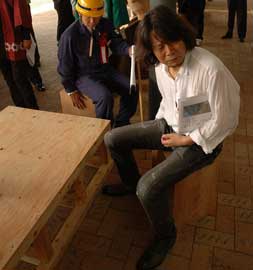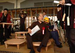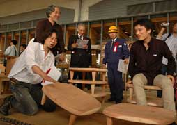 | 昨年に続き2度目の受賞。人のお尻に合うように微妙に凹んだ座面がこだわりのようです。 作業工程をお聞きしたところあの座面は職人泣かせです。しかも7脚も。。。 デザイナーのこだわりと、職人の意地の結晶『低スギあぐら椅子』。あっぱれです! |