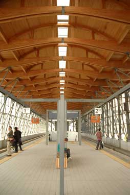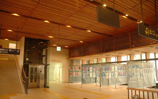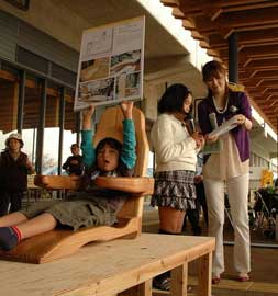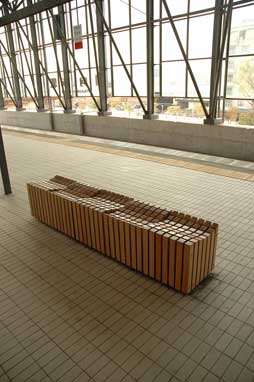 | 杉コレ2011in 日向の最終選考会の会場となった日向市駅。駅舎の設計は内藤廣建築設計事務所。ホームに置かれているベンチ(写真下右)は、杉コレ第1回グランプリ受賞、狩野新さんデザインの「ナミキの椅子」。 | ||||||||||||||||